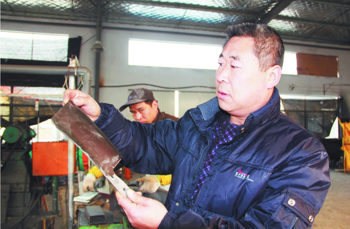 53岁的李进毕生的精力全部投在了刀具生产上,也是见证着高密菜刀一点点的发展变化。他告诉记者,“j9九游这个地区一直以来是出铁匠的地方,以前基本上村里的人都会打铁制菜刀,最早可以追溯到明清时期。由于从小耳濡目染,我从小就在村里的生产队里给村里打铁制刀,那个时候是纯手工,算是小铁匠,比较累。结婚后,同样从事着打铁,并逐渐地发展了自己的家庭小作坊式的生产,一步步发展到如今。”如今李进的前进刀具厂已发展为一家规模以上的企业,他也注册了属于自己的品牌,如今的李进菜刀销往全国各地,小铁匠也成了小老板。